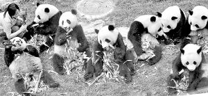6月2日,北京动物园召开新闻发布会宣布:5月24日从成都乘专机飞抵北京的8只大熊猫将在6月5日正式对外展出,与广大游客见面。目前,8只大熊猫身体状况良好。图为饲养员在给8只“奥运熊猫”喂竹笋。新华社发
