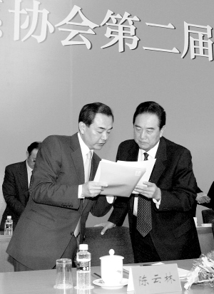 会议间隙中共中央台湾工作办公室、国务院台湾事务办公室主任王毅和新当选的海协会会长陈云林在交谈。 新华社记者 刘卫兵 摄