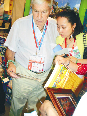 | 美中贸易发展协会主席罗浩民对海南的手工织锦非常感兴趣。