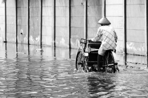 6月5日,在印度尼西亚首都雅加达北部,一名男子骑车从被海水淹没的街道经过。雅加达北部一些居住区近日遭受季节性涨潮的袭击,一些民房和道路被海水淹没。 新华社记者 张军 摄