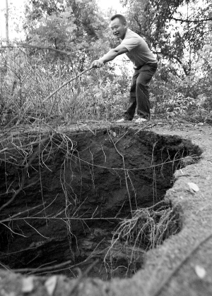 冯川说,昨天下午6点多时,他们养的一只小狗突然叫个不停,于是他们到鸡棚的后面一看,突然发现那里不知何时已塌下去一块,形成了一个直径约60公分宽的大坑,长在那个位置的一棵大灌木也掉进了坑里,周围的土还在不停地往下掉,冯川说当时还感觉到地面的土有些抖动。半个小时后,他们再次拿来手电筒一照,发现这个突然出现的坑大概有六七米深,已直径扩大到2米左右,他们说,如果有人或者有房子在那,估计就会整个掉下去的。