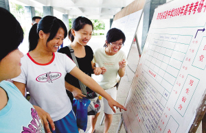 六月六日,几名考生在海南省实验中学高考点了解考场情况。 本报记者 苏晓杰 摄