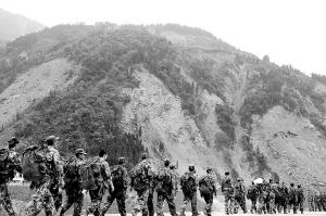 6月6日,驻扎在汶川县映秀镇的多支部队一大早便继续分片进山搜寻失事直升机。 新华社记者 李紫恒 摄