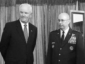 6月5日,美国国防部长盖茨宣布,解除美国空军部长迈克尔·温和空军参谋长迈克尔·莫斯利的职务。盖茨说,以往几次“意外”显示,空军在核武器管理方面存在漏洞。温和莫斯利分别是美空军文职和军职最高官员。 图为2006年10月14日,迈克尔·温(左)和迈克尔·莫斯利(右)在弗吉尼亚州阿灵顿参加纪念活动的资料照片。 新华社/路透