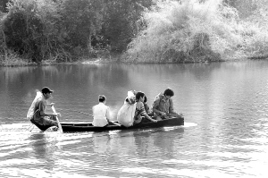 | 黎族村民乘坐独木舟横渡陀兴水库。