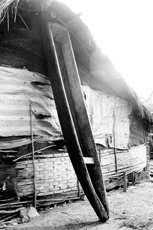 | 东方市感城镇陀头村的茅草屋下斜放着独木舟。 |