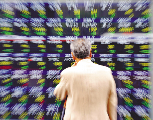| 6月9日,一名男子在日本首都东京凝视股价显示牌。当日日本东京股市日经股指下跌300多点。 新华社/法新 |