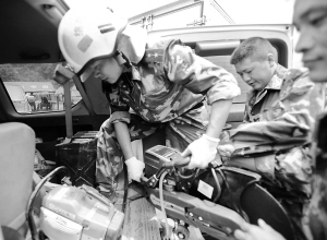 | 6月10日,搜救人员在四川汶川县映秀镇搬运切割设备,准备前往直升机失事地点。 新华社发 |