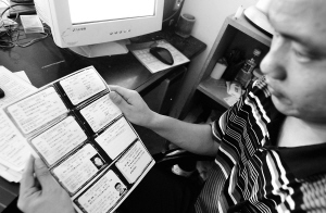 | 6月10日,海口南北通货运市场人员在整理物流司机存档资料。