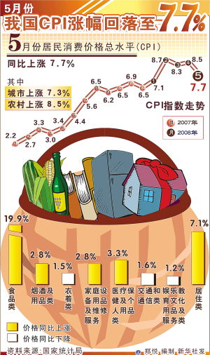 新华社北京6月12日电 (记者刘铮、周英峰)国家统计局12日公布的数据显示,5月份我国居民消费价格总水平(CPI)同比上涨7.7%,涨幅比上月回落0.8个百分点。