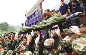 然而,9名危重伤员身体十分虚弱,留在龙池镇只有等死,必须把他们运到山外的医院进行急救。官兵们连夜用木棍、门板等材料连夜赶制了9副简易担架。5月15日,天刚蒙蒙亮,20多名队员抬起重伤群众开始往山外走。
