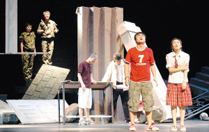 6月11日,话剧《在掩埋下雄起》在北京大学进行排练。由北京一九九八国际青年艺术剧团排演的抗震题材话剧《在掩埋下雄起》将于6月12日下午在北京大学百周年纪念讲堂举行首场义演。该剧取材于在汶川地震中为保护学生而牺牲的几位老师的英雄事迹。 新华社发