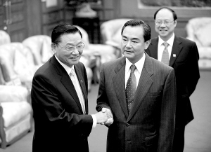 | 6月12日,中台办、国台办主任王毅在北京钓鱼台国宾馆会见海基会董事长江丙坤率领的海基会代表团。 新华社记者 李晓果 摄 |