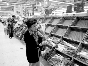 6月12日,在西班牙马德里市一家大型超市,一位市民在选购货架上不多的商品。为抗议油价上涨,西班牙卡车工人自6月9日开始举行全国大罢工,进而引发西班牙各地的商品供应短缺。 新华社记者 陈海通 摄