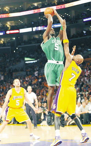 | → 6月12日,在NBA总决赛第四场比赛中,凯尔特人队客场以97比91战胜湖人队,以总比分3比1领先。图为凯尔特人队球员加内特(上)在比赛中投篮。 新华社发 |