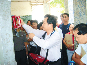 | 6月14日在海口市琼山三小,技术专家正在指导有关人员如何通过先进仪器检测墙体结构。 本报记者 张中宝 摄 |