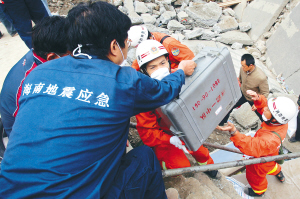 | 5月16日,北川县城,海南地震局地震工程结构专家和消防战士带着专业救援设备赶往救援现场。 本报记者 李英挺 摄 |