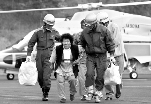 | → 6月14日,在日本北部的宫城县栗原市,救援人员护送一名从被困地带疏散出来的老人离开直升飞机。 新华社/路透 |