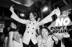 | 13日,在爱尔兰首都人们高举标语庆祝《里斯本条约》被否决。新华社/法新 |