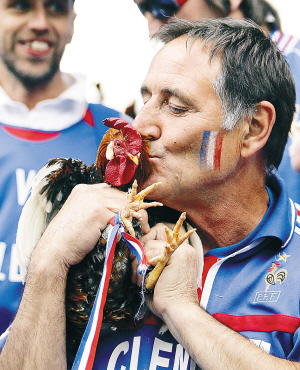 | 13日,在法国队与荷兰队赛前,一名法国球迷亲吻雄鸡。 新华社发 |