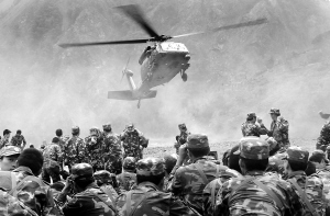 | 这是5月31日,成都军区某陆航团向唐家山堰塞湖运送武警水电官兵。