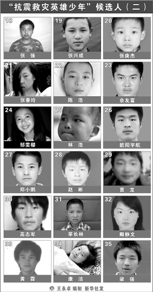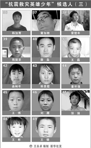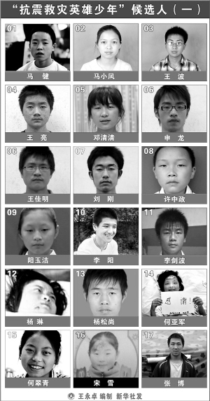 此次推荐候选人采取了多种方式,四川、甘肃、陕西、重庆四省市组织人员,深入灾区了解情况,听取群众意见;灾区机关、学校、村镇和社区等各级各类组织积极向所在省市组委会推荐;评选活动办公室向社会公布了推荐电话和电子邮箱,接受群众推荐。主办单位对各地报送的人选进行认真研究、讨论,最后确定了50名“抗震救灾英雄少年”候选人。他们是:马健,男,14岁,四川省阿坝州汶川县映秀镇漩口中学初三年级学生;马小凤,女,17岁,四川省德阳市绵竹市东汽中学高二年级学生;王波,男,16岁,四川省德阳市绵竹市东汽中学高一年级学生;王亮,男,17岁,四川省绵阳市北川中学高二年级学生;邓清清,女,14岁,四川省德阳市什邡市蓥华镇中学初一年级学生;申龙,男,17岁,四川省绵阳市北川中学高三年级学生;王佳明,男,18岁,四川省绵阳市北川中学高三年级学生;刘刚,男,17岁,四川省绵阳市北川中学高二年级学生;许中政,男,9岁,四川省成都市都江堰市新建小学三年级学生;阳玉洁,女,12岁,四川省成都市彭州市白鹿中心学校六年级学生;李阳,17岁,男,四川省绵阳市北川中学高一年级学生;李剑波,男,14岁,四川省绵阳市北川县民族中学初一年级学生;杨琳,女,14岁,四川省成都市都江堰市聚源中学初二年级学生;杨松尚,男,17岁,四川省阿坝州汶川县漩口中学高一年级学生;何亚军,女,11岁,四川省绵阳市北川县曲山小学五年级学生;何翠青,女,13岁,四川省广元市青川县木鱼中学初一年级学生; 宋雪 女,12岁,四川省德阳市绵竹市土门小学五年级学生;张博,男,藏族,18岁,四川省阿坝州理县中学高三年级学生;张强,男,16岁,四川省德阳市什邡市蓥华镇中学初三年级学生。张兴成,男,13岁,四川省阿坝州茂县凤仪小学六年级学生;张庚杰,男,8岁,四川省广元市剑阁县下寺小学二年级学生;张春玲,女,13岁,四川省绵阳市平武县石坎小学六年级学生;陈浩,男,12岁,四川省成都市温江区玉石乡实验学校六年级学生;佘友富,男,17岁,四川省阿坝州汶川县漩口中学高二年级学生; 邹雯樱 女,12岁,藏族,四川省阿坝州汶川县映秀小学五年级学生;林浩,男,9岁,四川省阿坝州汶川县映秀镇渔子溪小学二年级学生;欧阳宇航,男,17岁,四川省成都市彭州中学高一年级学生;郑小鹏,男,13岁,四川省德阳市什邡市红白中学初一年级学生;赵彬,男,15岁,四川省绵阳市安县茶坪初级中学初三年级学生;贾龙,男,16岁,四川省成都市都江堰市向峨中学初三年级学生;高志军,男,16岁,四川省绵阳市平武县平通中学初三年级学生;莘长林,男,7岁,四川省巴中市通江县永安坝村小学二年级学生;卿静文,女,17岁,四川省德阳市绵竹市东汽中学高一年级学生;黄霖,男,13岁,四川省绵阳市安县桑枣镇干柏村小学六年级学生;康洁,女,11岁,四川省阿坝州汶川县映秀小学六年级学生;梁强,男,16岁,四川省成都市都江堰中学高一年级宏志班学生;韩加育,男,18岁,四川省广元市青川县职业高级中学高二年级学生;甯加驰,男,15岁,四川省成都市都江堰市聚源中学初三年级学生;雷楚年,男,15岁,四川省成都市彭州市磁峰中学初三年级学生;熊弼呈,男,13岁,四川省绵阳市北川县禹里小学六年级学生;薛枭,男,18岁,四川省德阳市绵竹市东汽中学高二年级学生;王磊,男,12岁,甘肃省陇南市武都区桔柑学校四年级学生;曲柄年,男,14岁,甘肃省陇南市文县碧口二中七年级学生;韩贵霞,女,15岁,甘肃省甘南州舟曲县东山乡石家山小学六年级学生;童世强,男,13岁,甘肃省陇南市礼县祁山乡中王小学六年级学生;王博,男,11岁,陕西省宝鸡市陈仓区拓石镇中心小学四年级学生;刘潮,男,11岁,陕西省汉中市略阳县高台小学五年级学生;张强,男,12岁,陕西省汉中市宁强县巨亭乡中心小学五年级学生;王彬,女,8岁,重庆市梁平县文化镇中心小学二年级学生;王樊,男,12岁,重庆市梁平县文化镇中心小学六年级学生。(相关事迹见中国文明网、南海网)