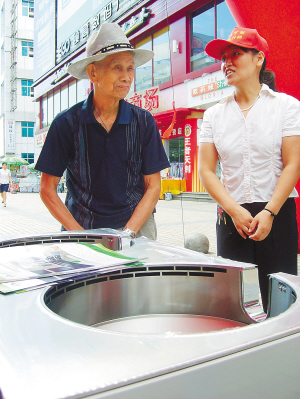 | 6月15日,在海口明珠广场举行的节能宣传周现场,有关人员向参观群众介绍节能环保灶具。 本报记者 张中宝 摄 |
