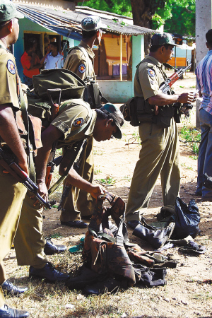 6月16日,一些警察在斯里兰卡北部瓦武尼亚地区的爆炸现场调查取证。斯里兰卡国防部16日说,反政府武装泰米尔伊拉姆猛虎解放组织(猛虎组织)当天上午在这里发动一起针对警察的自杀式袭击,导致12名警察死亡、20多人受伤。 新华社/法新
