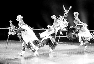 | 6月14日,中国非物质文化遗产展演中的四川民间歌舞专场,图为羌族艺人“释比”跳起了羊皮鼓舞。