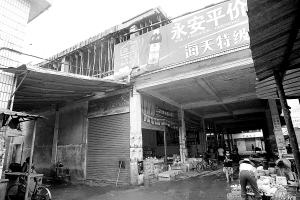 | 白水塘农贸市场及屋顶上正在加盖的违章建筑。 本报记者 古月 摄 |