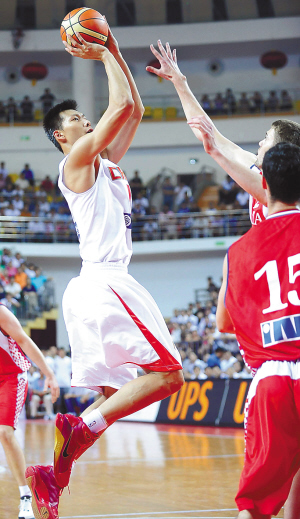 中国男篮16日以80:76第三次战胜来访的克罗地亚国家二队,易建联全场贡献26分,成为中国队5天内三胜对手的第一功臣。图为易建联在比赛中跳投。 新华社发