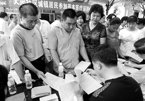 | 2007年7月11日,琼山区大园社区居民正在办理城镇居民医疗保险交费手续。当天,海口市城镇居民医疗保险征缴工作全面启动。