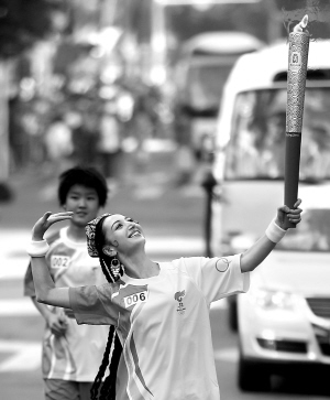 | 火炬手热娜在传递过程中跳起新疆舞。 新华社发 |