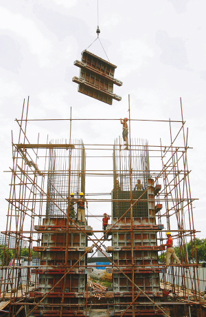| 6月17日,海南东环铁路海口特大桥施工现场,工人正在安装桥墩模板。 本报记者 宋国强 摄 |