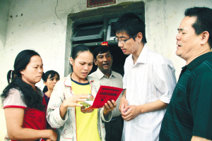 | 什玛村黎族妇女将格莱珉小额贷款的第一期本息交到孟加拉格莱珉信托派驻的指导专家手中后,领到一本还款凭证。 特约记者 黎大辉 摄 |