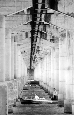 6月17日,在海榆东线南渡江第一大桥底,交通部公路科学研究所的专家正驾船观察桥墩表面是否有裂缝、露筋等缺陷,为大桥进行安全性能检测。