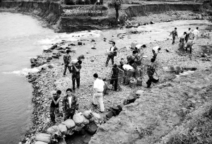 6月16日,安徽省休宁县民兵在齐云山镇用沙袋加固护岸。以迎接可能到来的更大汛情。 新华社发 |