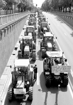 →6月18日,比利时农民将拖拉机驶入首都布鲁塞尔市中心进行抗议。当日,比利时肉制品和奶制品生产者在布鲁塞尔市中心抗议高油价和农产品价格走低。 新华社/路透