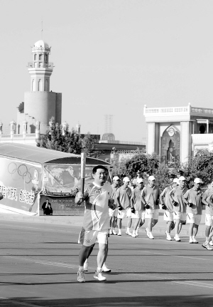 9时30分,奥运火炬传递起跑仪式在喀什市著名的艾提尕尔清真寺广场南侧举行,中国著名“达瓦孜”艺人———“高空王子”阿迪力担任第一棒火炬手。