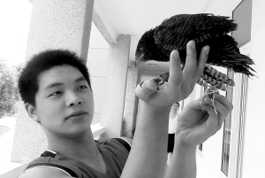 近日,一只腿部受伤的幼鹰飞落在驻琼海军某部一中队队部窗台上,被几名战士及时救治后,送往省小动物保护协会。这是一只属于鹰科类猛禽幼鹰,为国家二级保护动物。 本报记者 邱大军 通讯员 邢利民 吕家旺