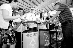 6月19日,商家展出的利用回收废纸压制而成的环保垃圾箱吸引许多客商前来咨询。 近日,在福州开幕的第二届海峡绿色建筑与建筑节能博览会上,参展单位推出的各种家庭节能、污水处理、环保建材等节能环保产品受到现场观众和与会客商的青睐,节能环保理念渐入人心。 新华社记者 姜克红 摄
