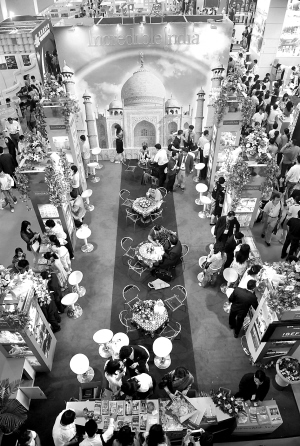 6月19日,观众参观颇有特色的印度展台。 当日,2008北京国际旅游博览会在北京展览馆开幕,来自81个国家和地区以及国内25个省市区的数百家旅游从业单位参会。 新华社记者罗晓光摄