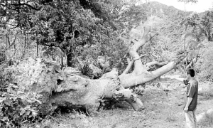 | 屯昌大同镇长尾村,这棵百年古榕被盗树者挖倒,但在村民的保护下没有被运出村子,免遭“背井离乡”厄运。 本报记者 于伟慧 摄 |