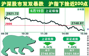 昨天的大阳线让不少投资者对后市出现利好充满期待,然而今天消息面上却比较平静,加上昨晚美国道琼斯指数再跌131.24点,盘中一度击破12000点的关键点位,技术走势比较恶劣。两市最终将昨日5%的升幅全部抹去,K线形态上出现了典型的阴包阳的看跌组合。个股普跌,跌停个股超过900家。终盘,沪综指下跌192.24点,收盘2748.87点,跌幅6.54%,离昨日低点仅有19.16点。深成指收盘9161.56点,下跌741.57点,跌幅7.49%。市场弱势一显无遗。