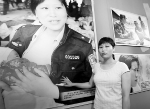 | 6月19日,报告团成员之一、四川省江油市公安局巡警大队民警蒋晓娟在以自己为主人公的图片前讲述图片拍摄时的情况。
