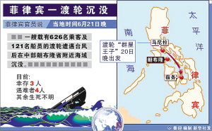 据新华社马尼拉6月22日电 (记者吴强)菲律宾官员22日说,一艘载有700多名乘客和船员的渡轮当天早晨遭遇台风后在中部朗布隆省附近海域沉没,目前仅找到3名幸存者和4具遇难者尸体,其余船上人员生死不明。