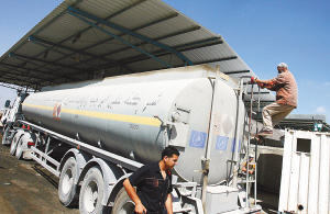 6月22日,在位于加沙地带与以色列之间的纳哈勒奥兹边境站,巴勒斯坦工人给一辆运送燃料的卡车加油。在以色列和巴勒斯坦各派别之间达成停火实行3天之后,以色列22日重新开放了其与加沙地带之间的货物口岸,允许更多的货物进入加沙地带。 新华社/法新
