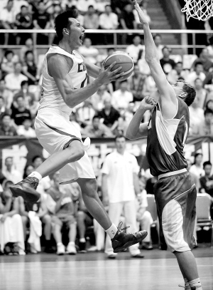 6月22日,中国男篮与立陶宛队在广东东莞进行一场篮球挑战赛,中国队以87:70获胜。图为易建联(左)篮下分球。 新华社发