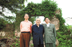 定安县春内村王映斗故居门前,王映斗第五代后人留影,左起王衍焘、王衍范、王衍鏊。