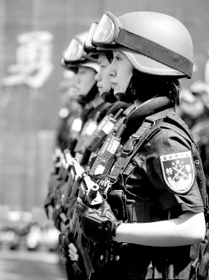 6月21日,北京市公安局特警总队一支队被命名为“蓝剑突击队”并授旗。近两年来,北京市公安局特警总队一支队成功完成多起现场处置、武装押运、高空营救等任务,目前,全体特警队员正在加紧学习和训练,全力为奥运安保工作做准备。 新华社记者 罗晓光 摄